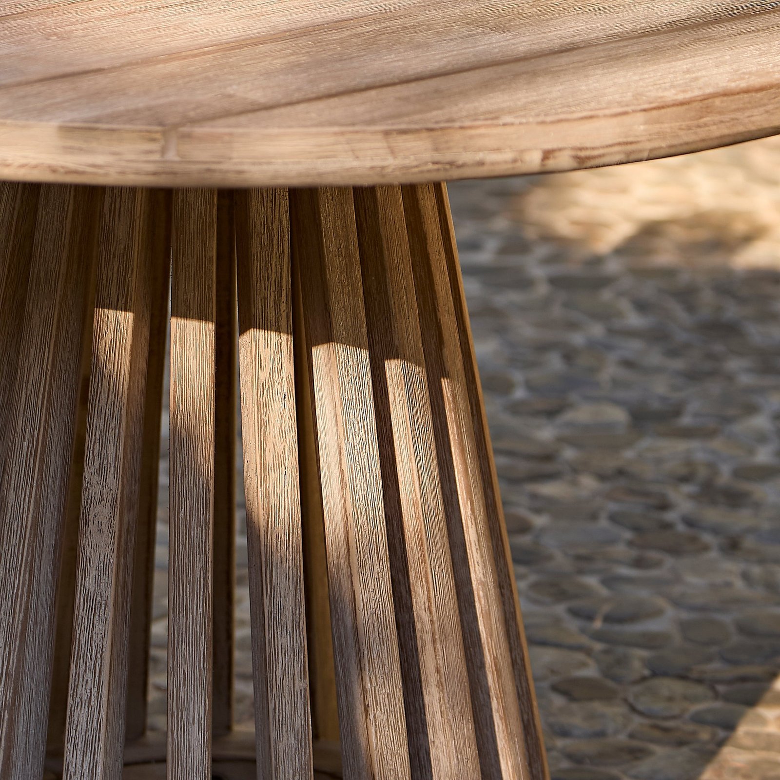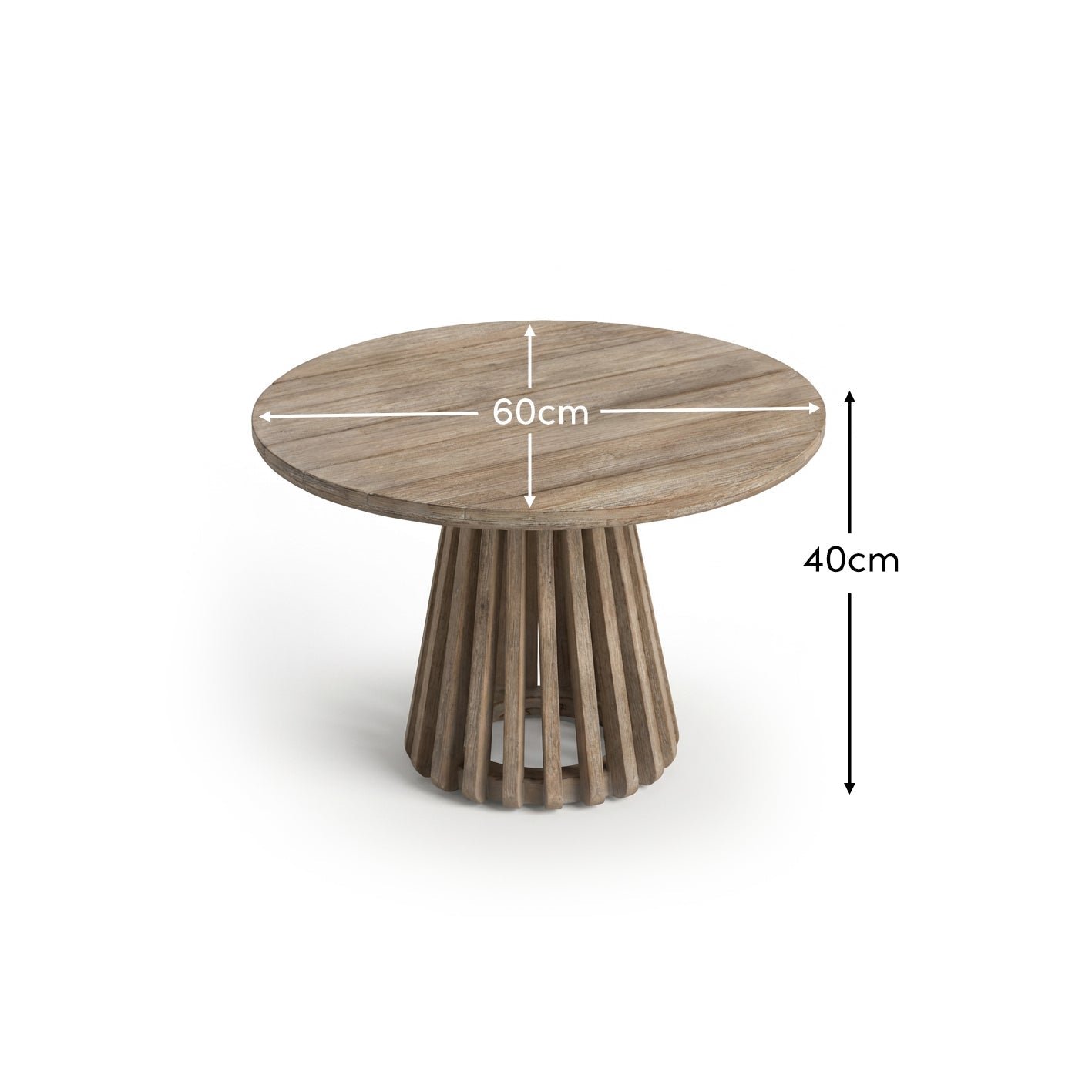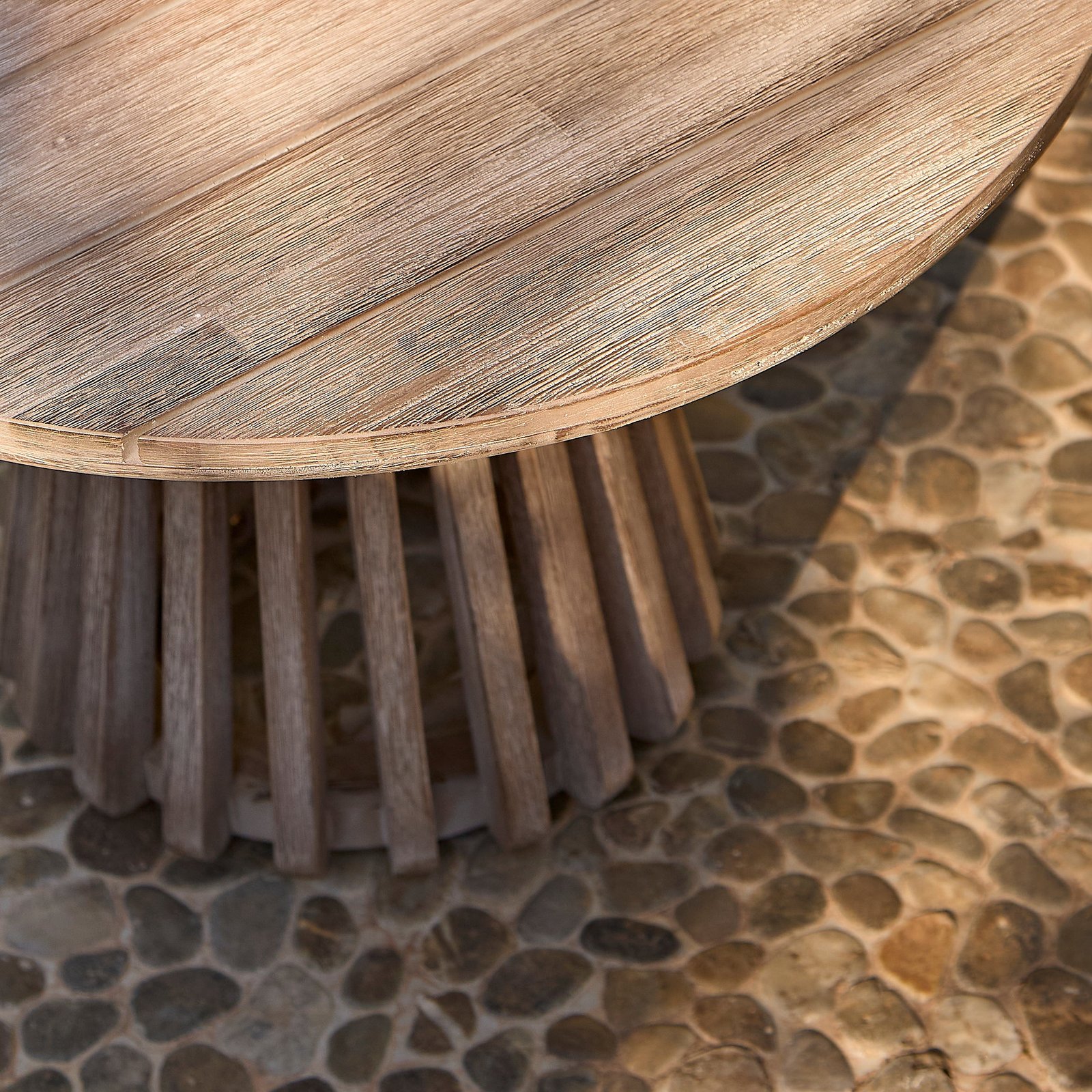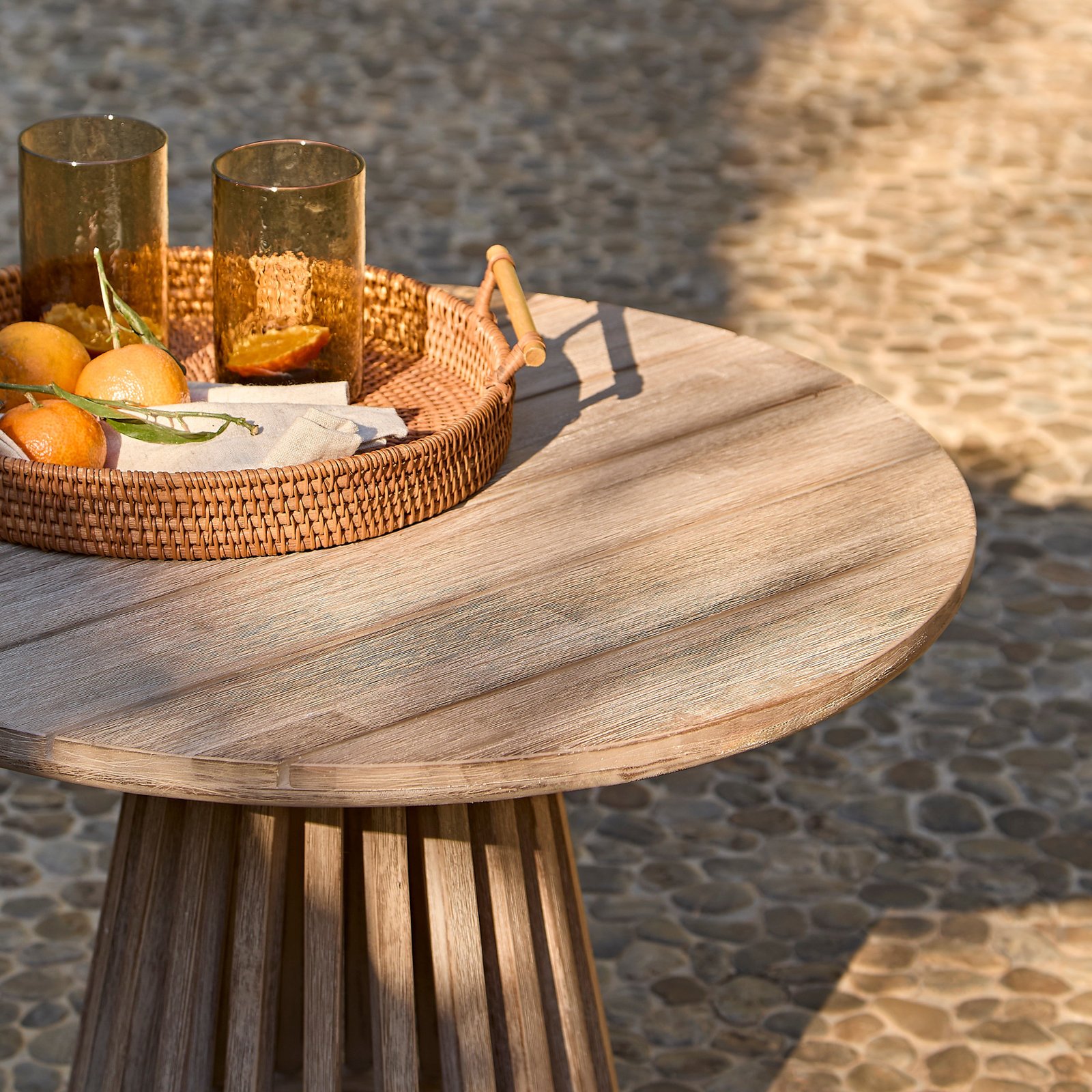 The round form creates a soft, inviting presence in your outdoor living space, while the brushed acacia finish adds natural warmth and texture. Ideal for holding refreshments, books, or decorative elements, this table is designed for those who appreciate the finer details of outdoor living.
